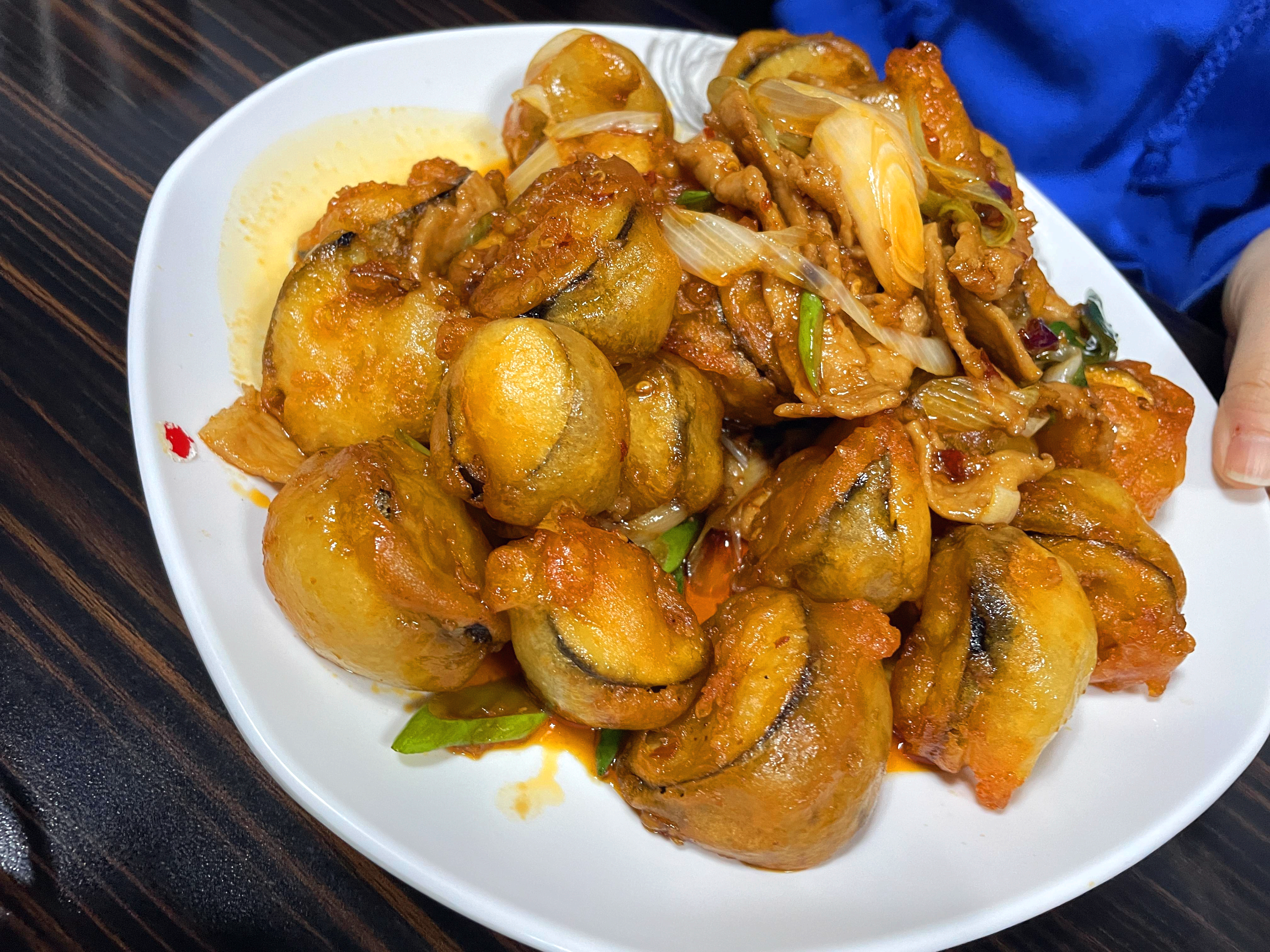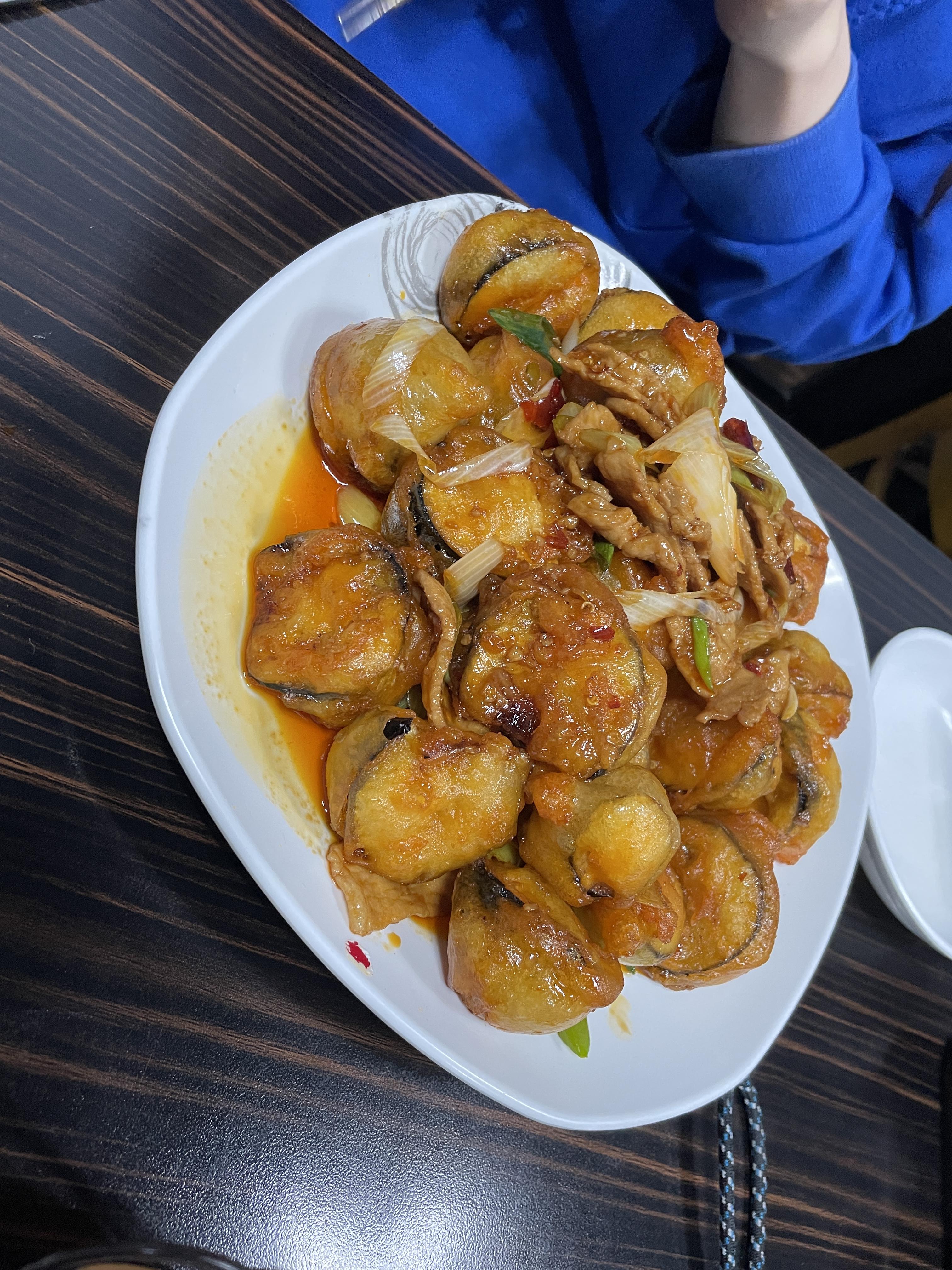 고추기름 베이스로 해서 돼지고기와 함께 나오는 가지튀김 요리는 맥주를 주문하지 않을 수가 없다.