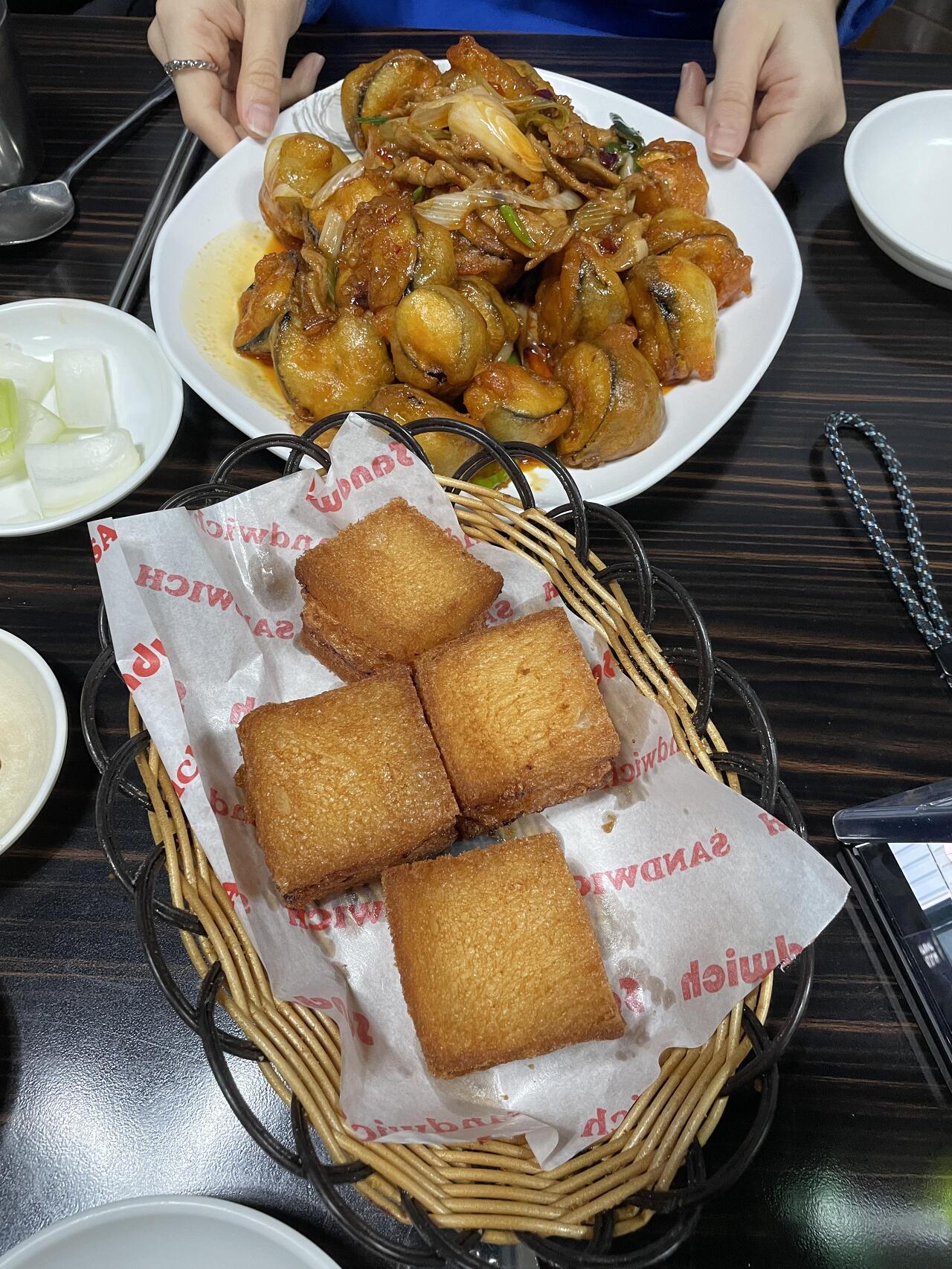 가지튀김이 고추기름 베이스로 되어 있기 때문에 매콤하고 알싸한 맛이 있는데 멘보샤는 입안의 화재를 진정시켜준다.