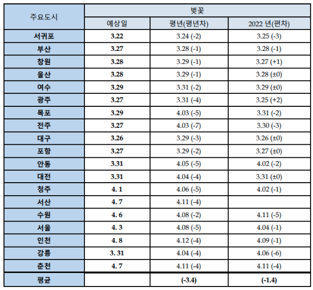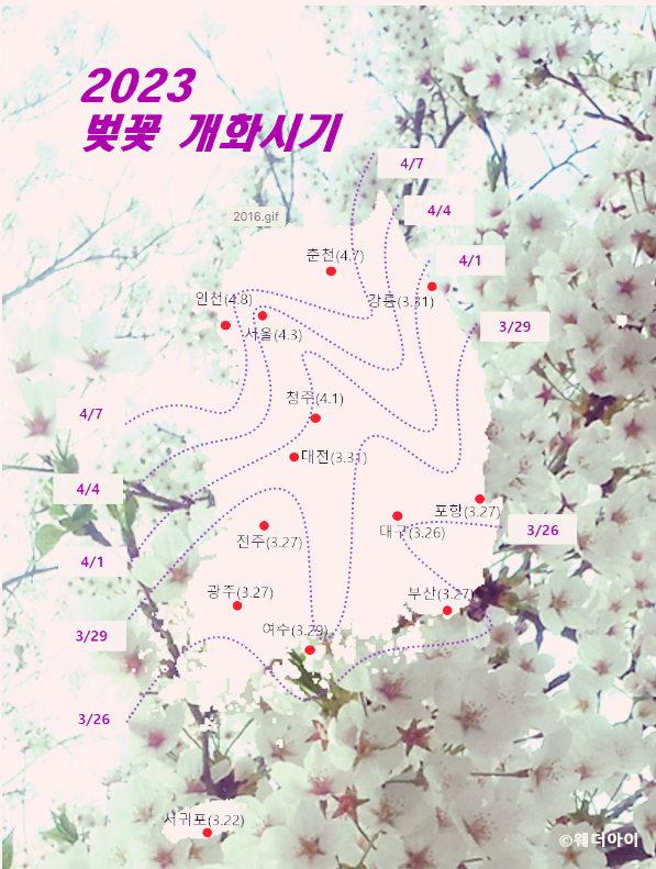올해 벚꽃 개화시기는 대부분의 지역들이 작년에 비해서 빨라진 것을 확인해볼 수 있습니다.