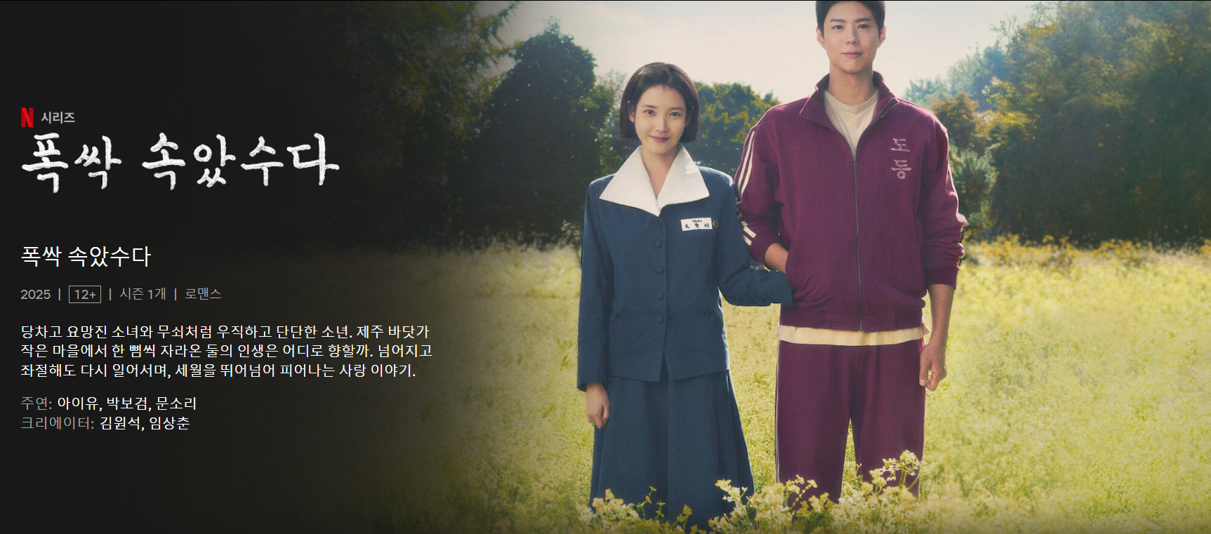 넷플릭스 오리지널 한국 드라마 중에서도 상당한 제작비가 투입된 <폭싹 속았수다>는, 한 편의 영화를 보는 듯한 생생한 화면과 높은 완성도를 자랑할 예정입니다.